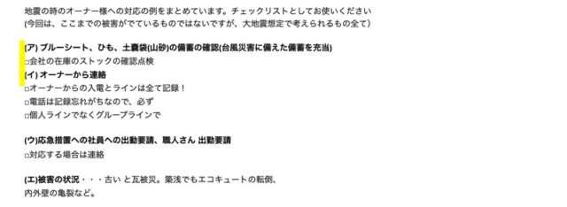 支援先工務店へは、安否を確認すると同時に下記をお送りしました。災害時に行うべき工務店→オーナー様への対応をまとめた資料です。