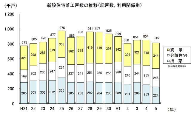 分譲住宅は24万6299戸で、同3.6%の減少となった。一戸建て(同6.0%減)が3年ぶりに減少。マンション(同0.3%減)も微かながら減少した。