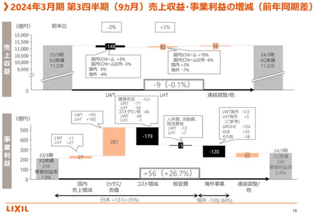 LIXIL(東京都品川区)が1月31日公表した2024年3月期第3四半期(23年4~12月)の連結決算は、為替の影響もあり、売上収益は前年同期比0.1%減の1兆1229円とほぼ横ばい。収益面は断熱リフォーム需要によるハウジングテクノロジー事業(LHT)の売上伸長、コスト削減の効果などにより、事業利益が同26.7%増の266億円、営業利益は同5.0%増の254億円に回復した。