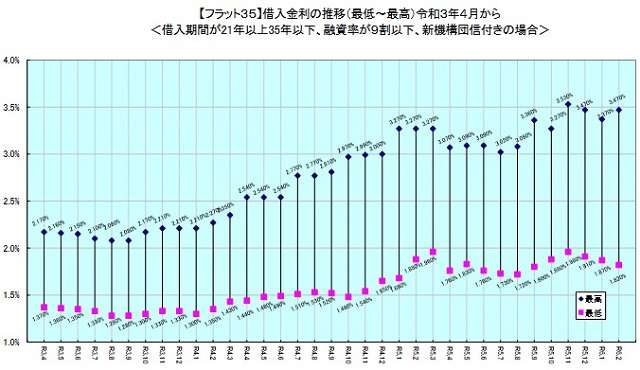 返済期間21年以上35年以下の最低金利は、融資率9割以下が1.82%、9割超が1.96%と、いずれも前月から0.05ポイント下がり、3カ月連続で下降した。最高金利は、9割以下が3.47%、9割超が3.61%で、前月から0.1ポイント上昇した。
