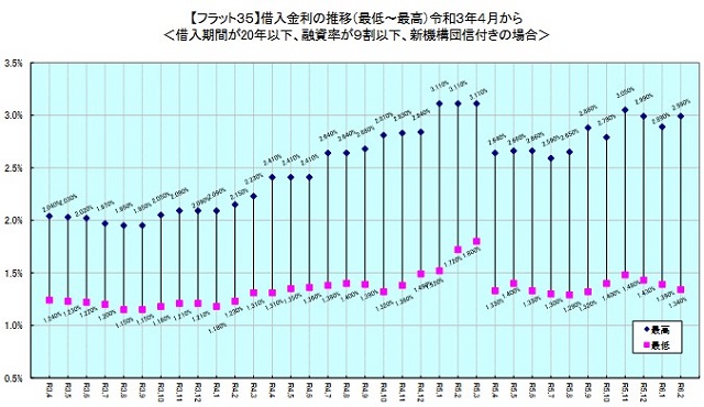 返済期間20年以下の「フラット20」の最低金利は、融資率9割以下が1.34%、9割超が1.48%で、前月から0.05ポイント下がり、3カ月連続で下降。最高金利は、9割以下が2.99%、9割超が3.13%だった。