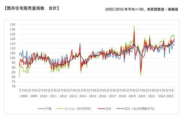 総務省統計局の「住宅・土地統計調査」で把握可能な「既存住宅取引量」には含まれていない別荘、セカンドハウス、投資用物件等を含む。各月の販売量における季節性を排除するため、月次指数において季節調整を行う。