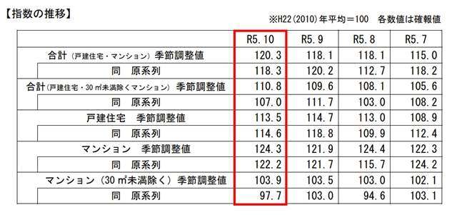 国土交通省は1月31日、登記データをもとに個人が購入した既存住宅の移転登記量を加工・指数化した「既存住宅販売量指数」2023年10月分を公表した。戸建て・マンション合計・季節調整値は前月比1.9%増の120.3、床面積30㎡未満を除いた合計・季節調整値は前月比1.1%増の110.8だった。このうち、戸建住宅の季節調整値は前月比1.1%減の113.5となっている。
