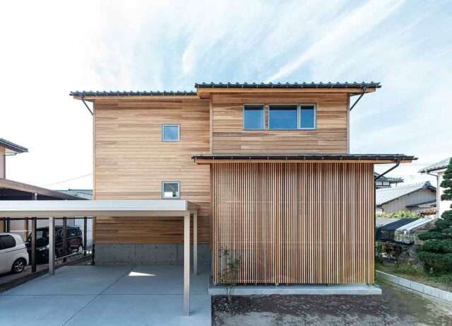 「下条町の家」北面の外観。スギ板を張って無塗装で仕上げた。切妻屋根を掛けて軒を伸ばした“家らしいかたち”は宮﨑建築が手がけた過去の事例の雰囲気にも通じる