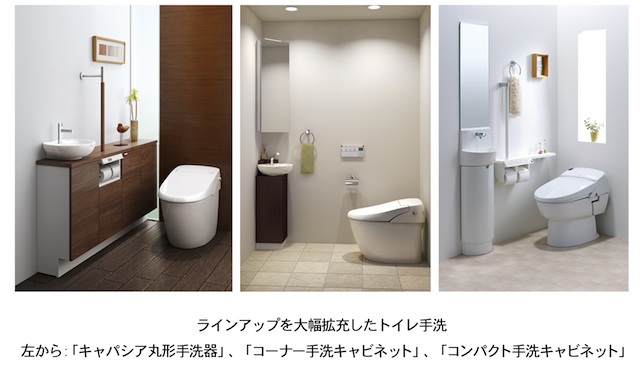 LIXIL(東京都千代田区)は2月1日、新しいタンクレストイレ「サティス」の発売に合わせ、デザイン性を向上したトイレ用手洗い3タイプ(「キャパシア」「コーナー手洗キャビネット」「コンパクト手洗キャビネット」)をリニューアルして発売する。