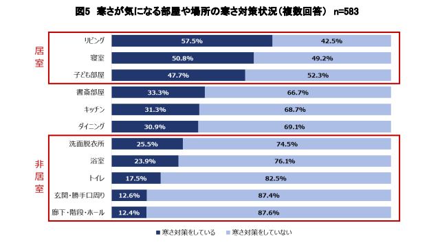 寒さ対策の状況を聞いたところ、居室(リビング・寝室・子ども部屋)では、半数前後が寒さ対策をしているにもかかわらず、非居室(洗面脱衣所・トイレ・廊下など)では、寒さ対策をしている人は1~2割程度しかおらず、ほとんどの人が寒いと感じながらも、対策をしていないことがわかった。