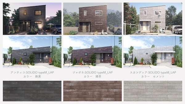 ジブンハウスは、同じ模様がなく、経年変化で魅力・価値を増す点を評価して「SOLIDO typeM_LAP」を外装に採用することを決定。「アンティコ/鉄黒」「ジャポネ/錆茶」「スカンディア/セメント」の3色を標準仕様に設定した。