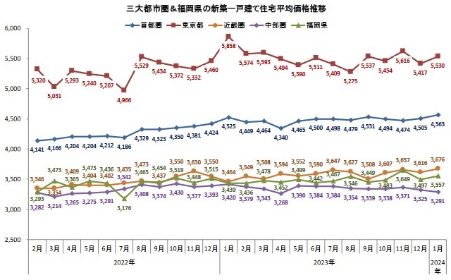 中部圏(4県)は、前月比1.0%減の3291万円と2カ月連続下落した。愛知県は0.3%増の3531万円と反転上昇したが、分譲戸数は12.3%減と大きく減少。静岡県の分譲数が愛知の減少分を上回ったことで、中部圏の戸数を14.7%増と大きく押し上げた。名古屋市は2.9%増の4078万円と反転上昇し、再び4000万円台に乗せたが、平均建物面積は3カ月ぶりに100㎡を下回った。