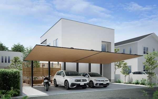 昨年、カーポートSCから「後方支持2台用」を発売。フロント部分が180°オープンで前方・左右に柱がないため、車の出し入れ、人の乗り降りがスムーズにできるのが特徴となっている。