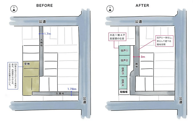 京都市内に約4330本ある袋路に面した住居では、空き家化・老朽化が進んでいるが、敷地が建築基準法上の道路に2m以上接していないとして再建築不可となるケースが多いという。再建築不可の建物は、土地の利用価値や資産価値が低いとみなされてしまうのに加え、安全性、都市防災上の課題となっている(なお、特定行政庁が交通・安全・防火・衛生上で支障がないと認め、建築審査会の同意を得て許可した場合は再建築可能)。