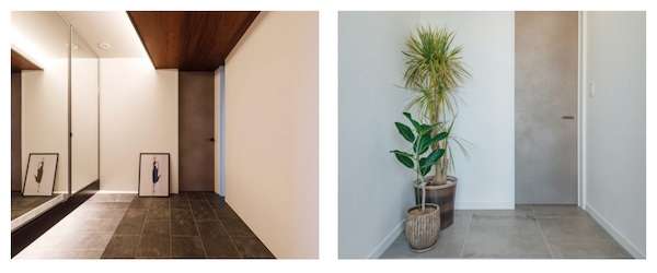 扉を閉めた状態だと表からも裏からも金属プレートや丁番が見えず、ドアパネルのシャープな縦ラインが際立つデザインとした。