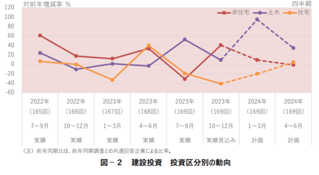 建設業の建設投資額は同0.9%増の見込み。ただし、2023年7~9月期(実績)は同32.3%減、10~12月期(実績見込み)は同11.1%減、2024年4~6月(計画)は同5.6%減の見込みで、全体としては減少傾向が続いている。