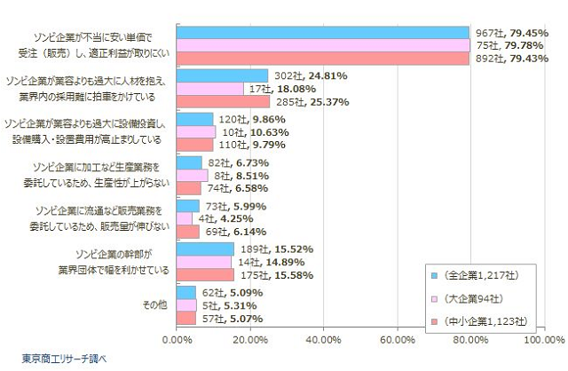 市場への悪影響を感じる企業に理由を聞いたところ、「ゾンビ企業が不当に安い単価で受注(販売)し、適正利益が取りにくい」が79.4%(1217社中967社)でトップだった。産業別では、不動産業が55.1%と半数にとどまった一方、「2024年問題」に直面する運輸業は95.3%、建設業は85.1%に達した。企業支援のボリュームや取引先との深化が、産業ごとに異なることなどが影響しているとみられる。