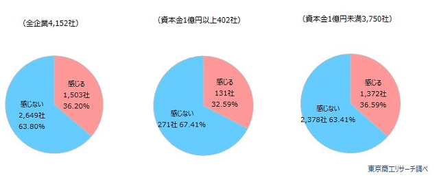 一方で、融資や補助・助成金などがなければ、事業の継続が難しい状況にあると「非常に感じる」企業は10.7%(4584社中491社)だった。「少し感じる」(20.5%、943社)を合わせると、31.2%が融資や資金的支援がないと存続が難しいと回答した。規模別では、大企業で「感じる」は18.4%(439社中81社)なのに対し、中小企業では32.6%(4145社中1353社)だった。業種別では、「感じる」で最も多かったのは「社会保険・社会福祉・介護事業」の68.1%(22社中15社)、「感じない」(全く感じない+あまり感じない)は「保険業」の100.0%(12社中12社)だった。