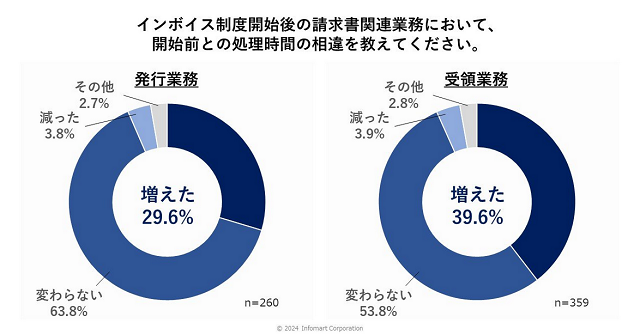 発行・受領する請求書の処理時間については、発行業務の29.6%(n=260)、受領業務の39.6%(n=359)で「処理時間が増えた」と回答。具体的な業務内容として、発行側では消費税の計算、受領側では事業者登録番号の確認や記載不備のチェックなどがあげられ、業務フローの変化によって業務負担が増えている現状が明らかとなった。一方、「郵送の手間が省けた」「ペーパーレス化が進んだ」「請求書の処理時間が短縮された」など、デジタル化によるメリットも寄せられた。
