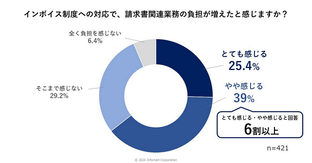インボイス制度への対応で、請求書関連業務の負担が「増えたと感じる(とても感じる25.4%・やや感じる39%)」のは64.4%にのぼることがわかった。担当者別では、経理・財務担当者の「とても感じる」「やや感じる」が82.4%なのに対し、担当者以外では59.8%となり、経理・財務担当者の負担増が明らかとなった。
