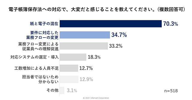 電子帳簿保存法への対応で、経理業務の負担が「増えると思う(かなり増えると思う32.4%・少し増えると思う38.6%)」と回答したのは7割以上となった。要件に対応した業務フローの変更やシステムの導入が必要なため、インボイス制度同様に業務の負担が増加するとみられる。7割が「紙と電子の混在」を大変だと感じており、さらなる負担増が懸念されている。