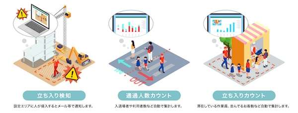立ち入り検知、通過人数カウント、立ち入りカウントを活用することで、建築・土木現場においては進捗管理、稼働人員の最適化・効率化、資材の盗難防止、安全管理に役立てることができる。また、公共空間ではカメラ映像内の往来人数を計測して人の流れを定量的に把握し、イベント企画やまちづくりの検討に利用できるとする。