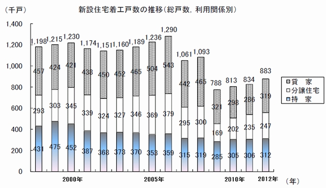 国土交通省が1月31日発表した2012年の新設住宅着工戸数は、前年比5.8%増の88万2797戸で、3年連続で増加した。持家は2.0%増の31万1589戸、戸建て分譲住宅は5.0%増の12万2590戸で、ともに3年連続の増加。マンションも5.5%増と3年連続で増加し、12万3203戸だった。貸家は11.4%増と4年ぶりに増加に転じ、31万8521戸と2009年以来3年ぶりに30万戸を超えた。地域別では、復興需要が旺盛な東北が39.9%増と全体を牽引した。
