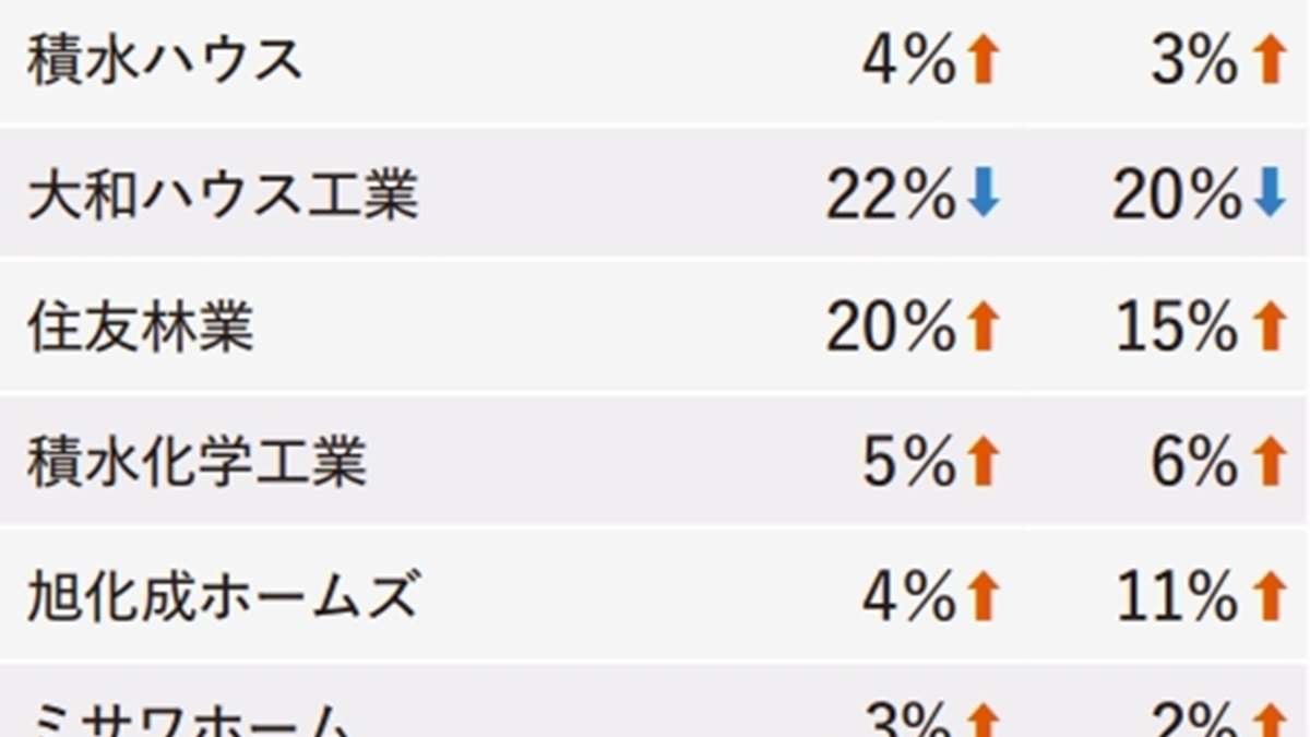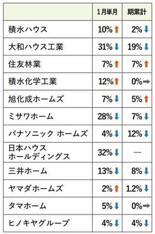 減少したのは8社。好調だった旭化成ホームズ(7%減)は5カ月ぶりに減少した。パナソニックホームズ(4%減)とタマホーム(5%減)は4カ月ぶり、ミサワホーム(28%減)は3カ月ぶりに減少した。大和ハウス工業(31%減)、日本ハウスホールディングス(32%減)、三井ホーム(13%減)、ヒノキヤG(4%減)は低調が続いている。