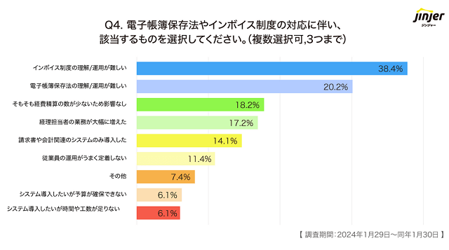 jinjer(東京都新宿区)は2月19日、企業の経理・情シス担当者計603人を対象に実施した「インボイス制度・電子帳簿保存法への対応」の実態調査の結果を発表した。調査期間は1月29日~30日。インボイス制度について「理解/運用が難しい」と回答したのは38.4%、電子帳簿保存法で「理解/運用が難しい」は20.2%となり、合わせて約60%の企業が両制度の理解や運用に課題を感じていることがわかった。そのほか運用面の課題として「経理担当者の業務が大幅に増えた」(17.2%)、「従業員の運用がうまく定着しない」(11.4%)などが目立つ。