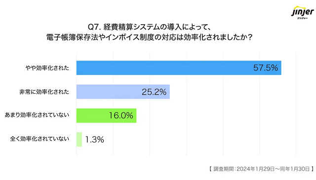 経費精算システムの導入状況について聞いたところ、「システム導入あり」は50.7%、「システム導入なし」は26.2%、「導入状況を把握していない」は23.1%だった。経費精算システム導入によって、電子帳簿保存法やインボイス制度への対応が「やや効率化された」は57.5%、「非常に効率化された」は25.2%で、約80%の企業が効率化を実感しているという結果になった。「あまり効率化されていない」は16.0%、「全く効率化されていない」は1.3%だった。