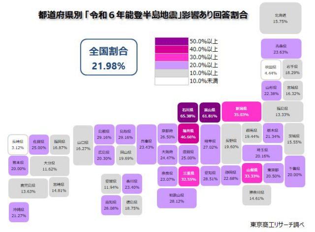 都道府県別では、被災地である「石川県」が65.3%、「富山県」61.8%、「福井県」46.6%、「新潟県」35.0%。被災地以外についても、三重県、山梨県で30%を超える企業が影響を受けている。