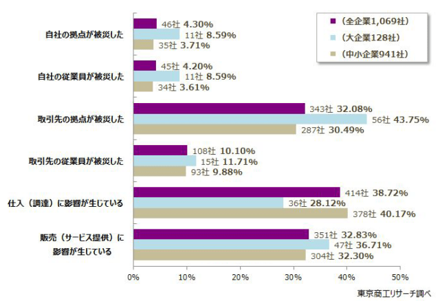 地震の影響を規模別で見ると、「大いに影響がある」は大企業(資本金1億円以上)が4.3%、中小企業(同1億円未満)が2.9%、「少し影響がある」は大企業が22.3%、中小企業が18.5%だった。