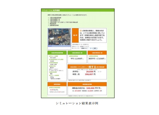 ウェブ上にある航空写真地図から自宅を指定し、屋根面の傾斜や設置箇所、現在の毎月の電気代、太陽光発電パネルメーカーなどの基本条件を選択・入力すると、年間の予想発電量や家計貢献金額、CO2排出抑制量、補助金情報といった診断結果を知ることができる。希望者はさらに、見積もり依頼もサイト上から行える。
