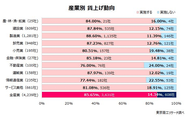 賃上げ実施率は全産業で大企業が中小企業を上回った。実施率の差が最も大きかったのは不動産業で、大企業が100.0%(11社中11社)なのに対し、中小企業は73.0%(89社中65社)と27.0ポイント差となった。建設業は、大企業100.0%(31社中31社)、中小企業87.1%(578社中504社)で12.9ポイント差。人手不足の産業では人材確保のための賃上げも多いが、原資を確保できない中小企業などで賃上げを断念せざるを得なくなっている可能性もある。