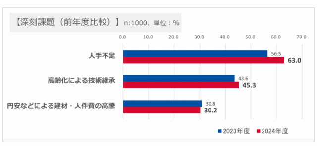 『建設業界で最も深刻な課題』を聞いたところ、全体では「人手不足」との回答が63.0%(前回調査:56.5%)で最も多かった。次いで「高齢化による技術継承」(45.3%)、「円安などによる建材・人件費の高騰」(30.2%)となった。施工関連業務の従事者(施工管理、施工、専門工事)に限った結果を見ると、1位(人手不足)、2位(高齢化による技術継承)は同じだが、3位は「労働時間が長い・年間休日が少ない」(31.0%)となった。