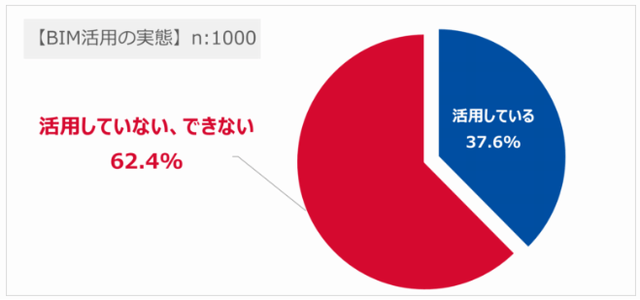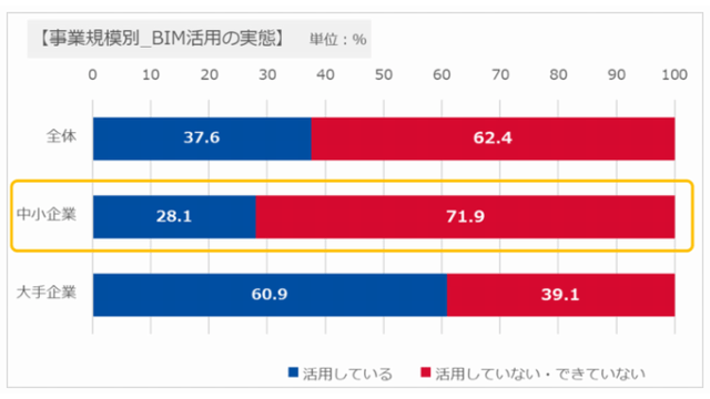 『BIM活用の実態』を調べたところ、全体では62.4%が「活用していない・できない」と回答した。事業規模別では、大手企業では60.9%が「活用している」と答えたのに対し、中小企業では「活用している」は28.1%にとどまった。業種別では特に、サブコン、工務店、専門工事店などで「活用している」の割合が低かった。