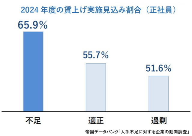 人材の確保・定着に欠かせない「賃上げ」についても意見を聞いた。24年度での正社員の賃上げ実施見込みは、人手不足を感じている企業では65.9%が「賃上げを行う」と回答。正社員の数が「適正」な企業が55.7%、「過剰」が51.6%だったのに比して、高い水準となっている。