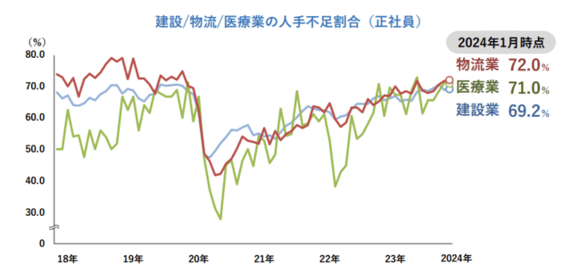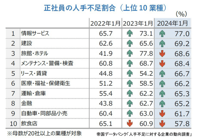 正社員の人手不足割合は、「情報サービス」(いわゆるIT企業)が最も高く77.0%。「2024年問題」が懸念される建設業(69.2%)、物流業(72.0%)、医療業(71.0%)で、それぞれ7割程度に達した。4月以降、人材不足の一層の深刻化が懸念される。