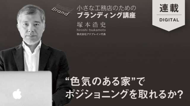 アドブレイン・塚本浩史さんの連載「小さな工務店のブランディング講座」が、“実践編”として再スタート。塚本さんがブランディングを手がけた工務店の実例をもとに、ブランディングのポイントを解説します。第1回は、有力工務店も多いエリアで、より上質な顧客層を狙うものづくり型工務店の事例です。(偶数月30日号に掲載予定)