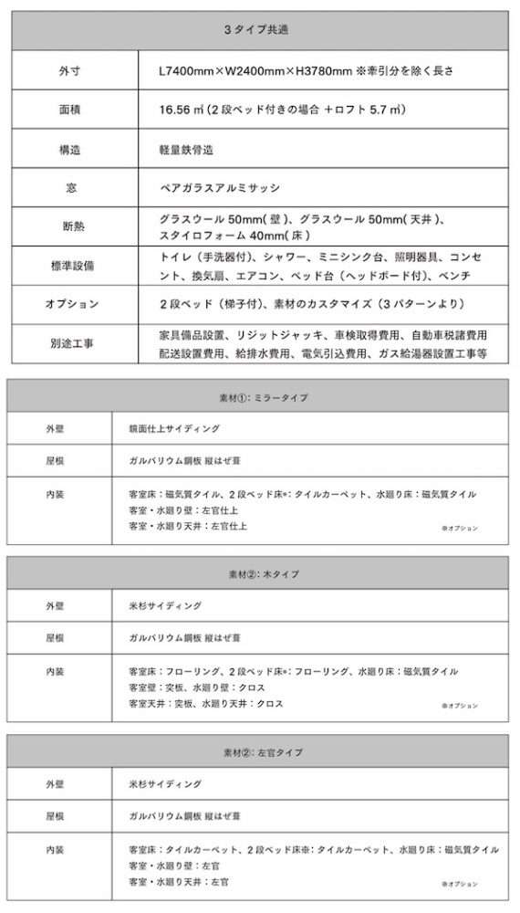 様々な場所に運べる・設置できるというトレーラーハウスの魅力を生かし、設置場所や演出したい雰囲気に合わせて外壁・内壁の素材をミラータイプ、木タイプ、左官タイプの3つから選ぶことができる。