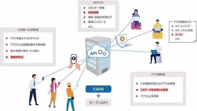 同実証実験では、空調、照明、エレベーターなどビルの基本設備の操作、それらのリアルタイムデータ及び蓄積されたデータ群を、統一的なAPI(Application Programming Interface)として提供する。アプリケーションを開発できる建物モデル構築の足掛かりになると考えられる。