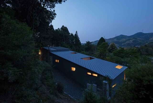 「森縁の家」を東側から見る。斜面に沿って4つの床レベルを設定することで、周囲の環境に溶け込んでいる
