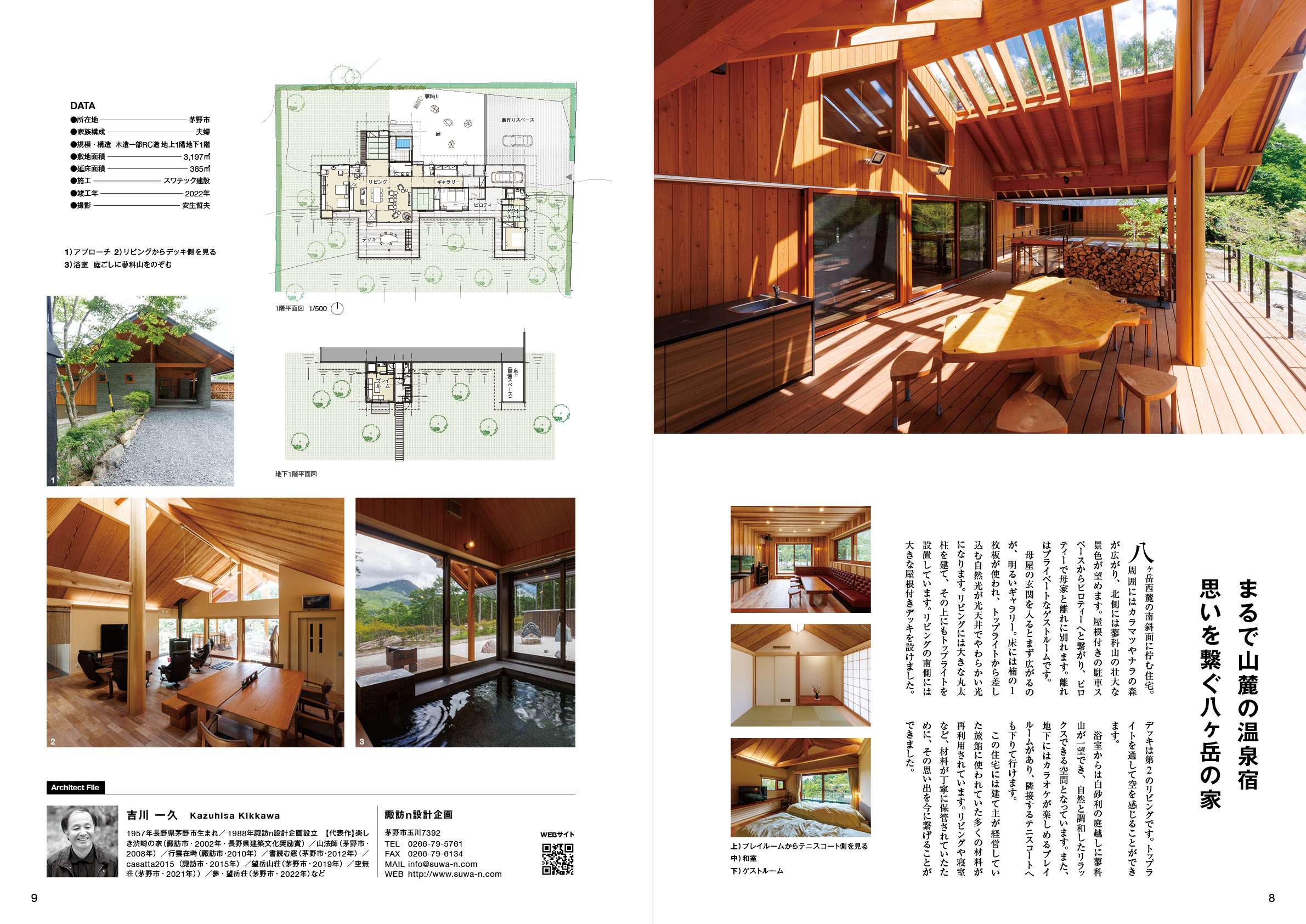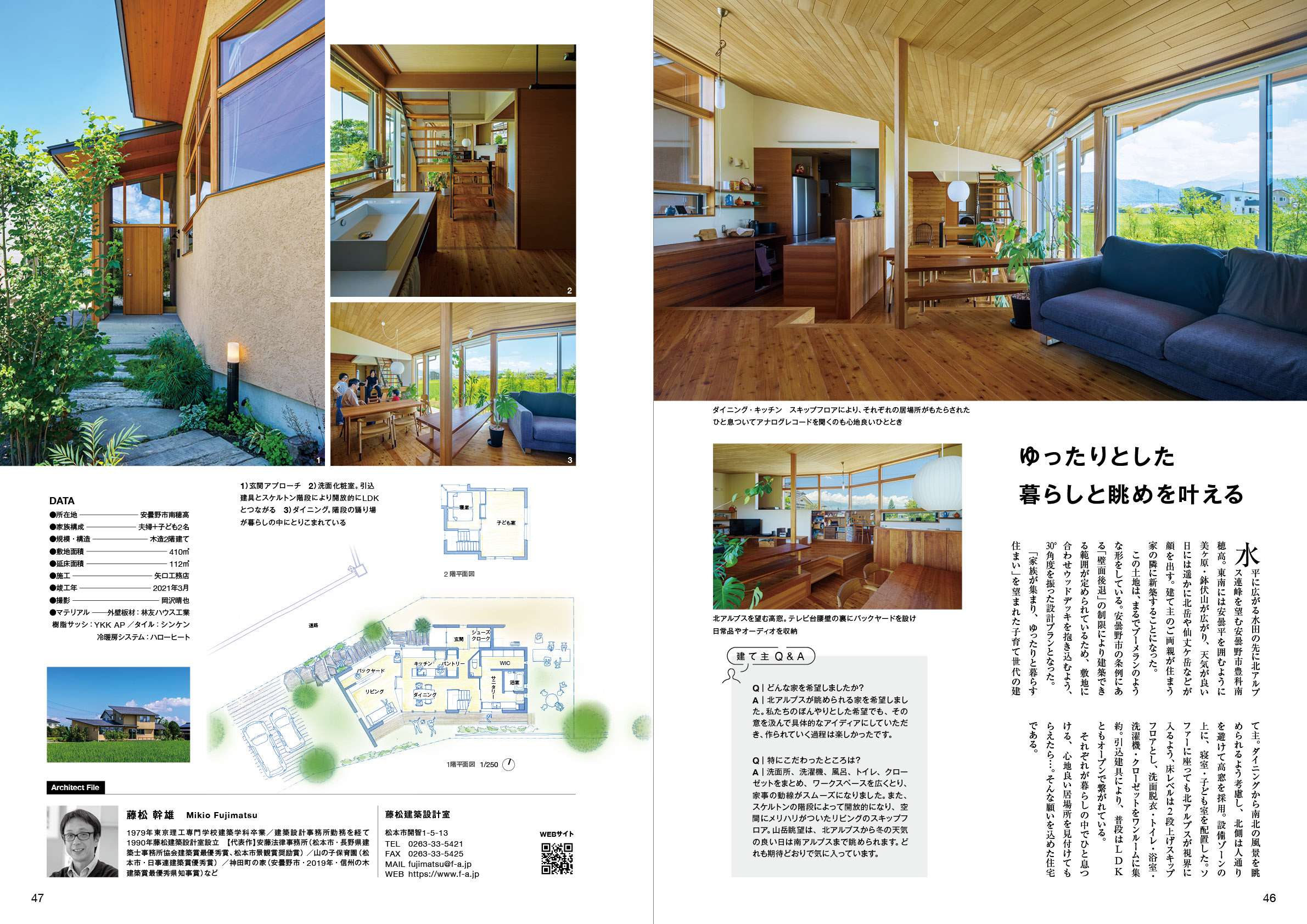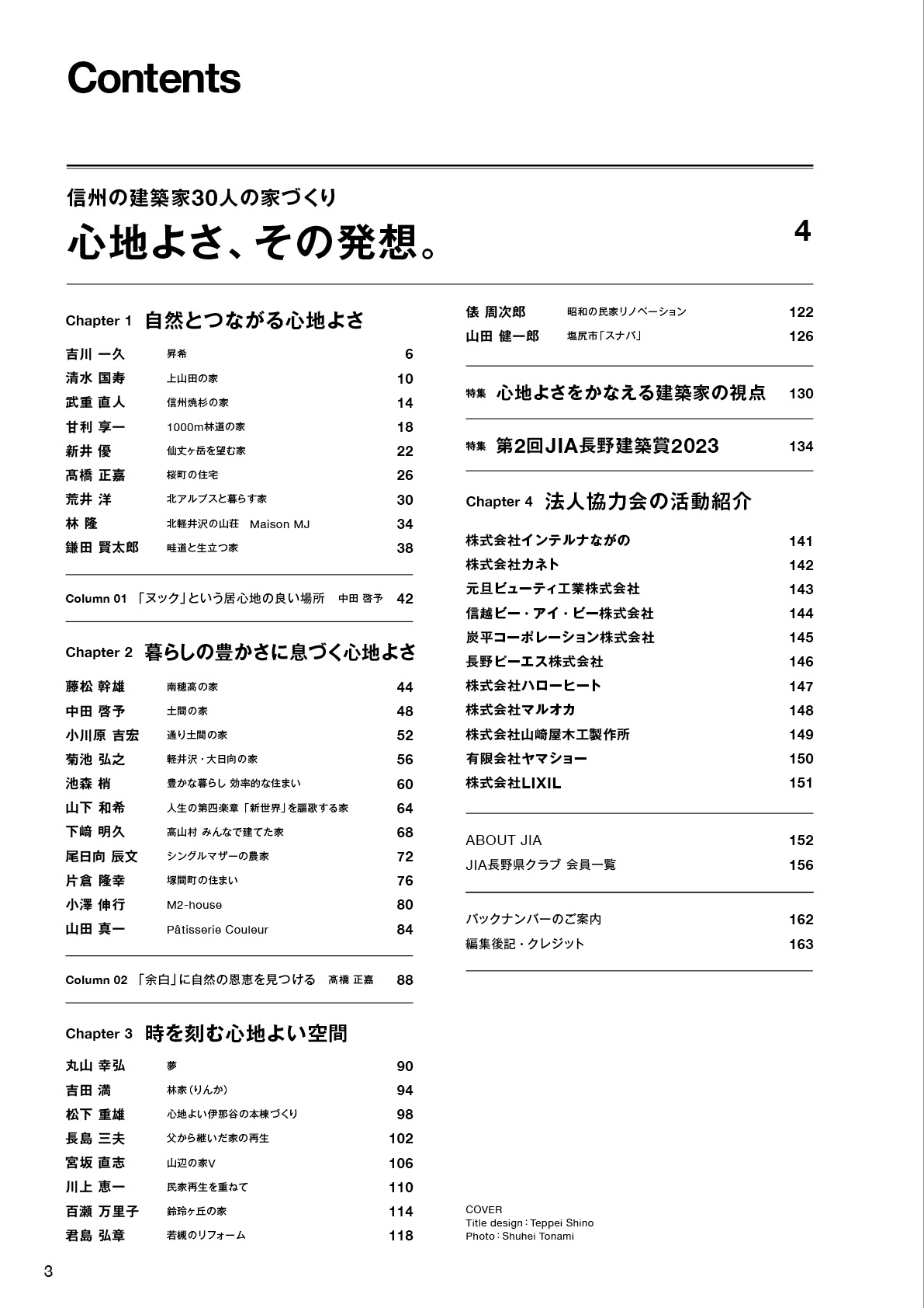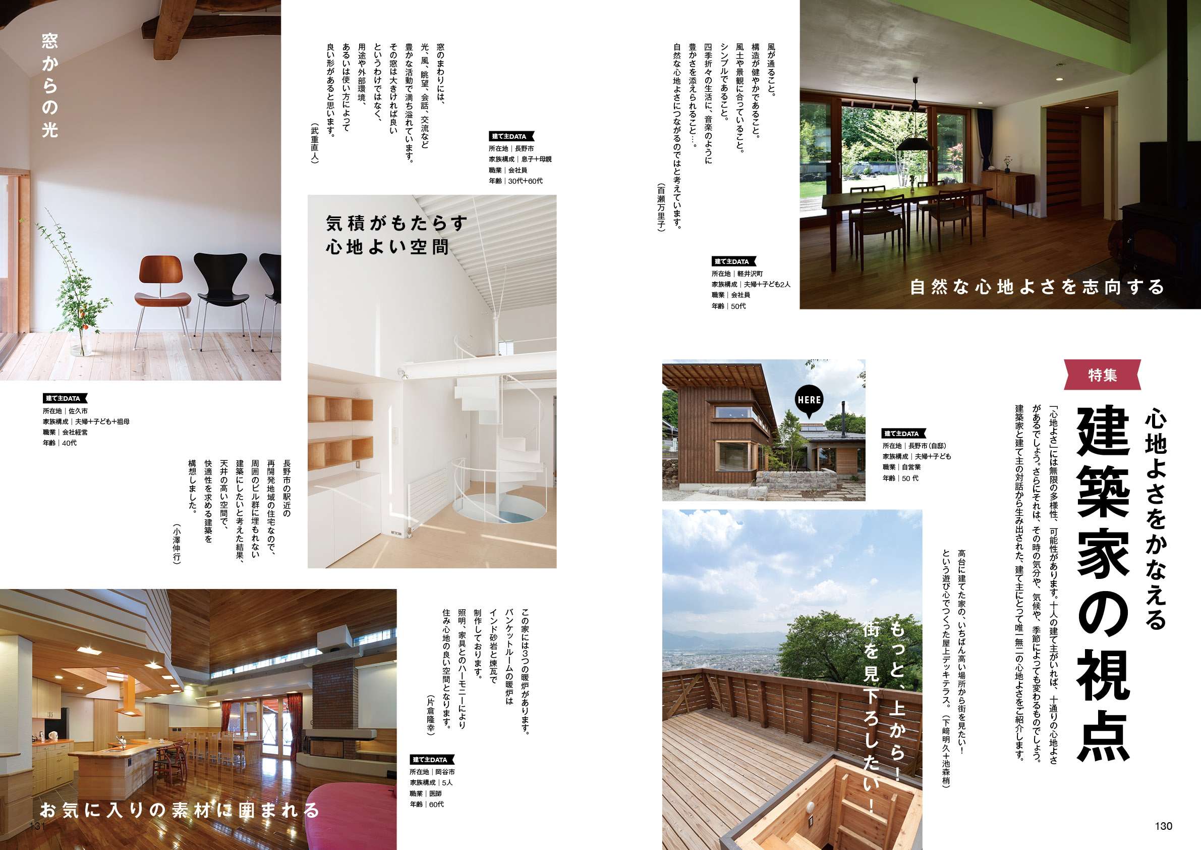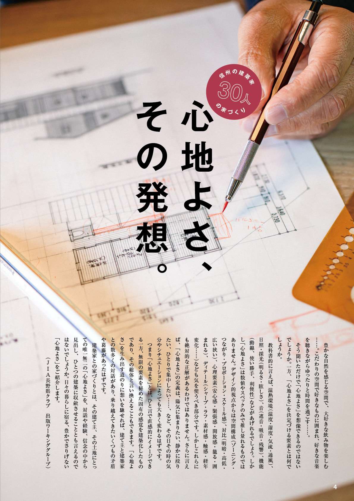 南アルプスを望む景観を生かしたリビングの家、 自然と調和した北軽井沢の山荘、 街中の実家を省エネ住宅にリノベーションした事例など、地元で活躍する建築家が、住まい手に寄り添った30の家づくりを紹介。カラマツや焼杉など地域の素材や、四季折々の景色を取り込む開口部・緑に開かれたウッドデッキ、土間を生かした空間など、様々な「心地よさ」に迫ります。