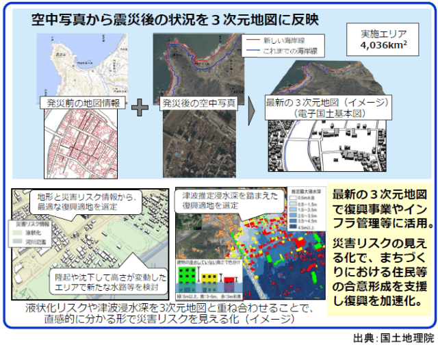国交省は、電子国土基本図を更新・3D化することで、地形や建物を俯瞰(ふかん)的に可視化することが可能となり、復興の加速化に貢献できると説明している。