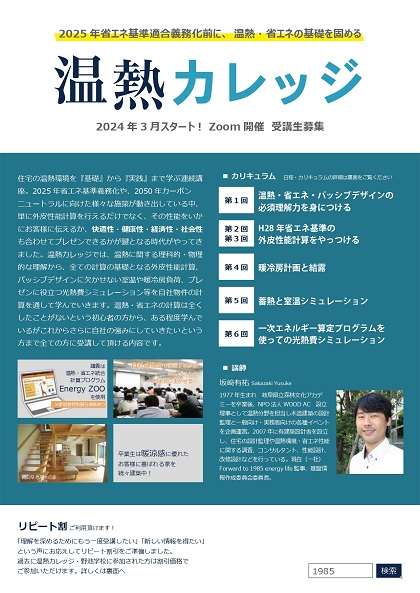 「温熱カレッジ」では、温熱に関する理科的・物理的な理解から、全ての計算の基礎となる外皮性能計算、パッシブデザインに欠かせない室温や暖冷房負荷、プレゼンに役立つ光熱費シミュレーションなどを、自社物件の計算を通して学ぶことができる。計算を全くしたことがないという初心者から、ある程度は学んでいるがさらに自社の強みにしたいという人まで広く学ぶことができるカリキュラムとなっている。講師は、Forward to 1985 energy life監事、基盤情報作成委員会委員長の坂﨑有祐氏。
