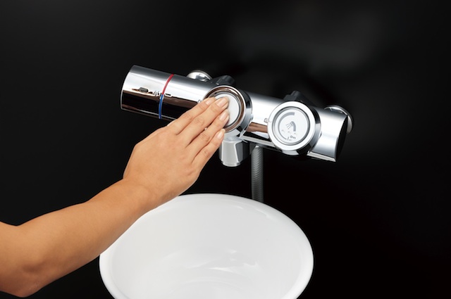 浴室用の水栓金具は、押すだけで湯水の出し止めができる「プッシュ水栓」を取り替えにも対応できる壁付仕様で発売する。ひねらずに手元で簡単に止水できるうえ、大きなジョグダイヤルを回して流量調節が可能。従来比約48%の節水を実現、年間で最大2万1000円の節約につながるとする。