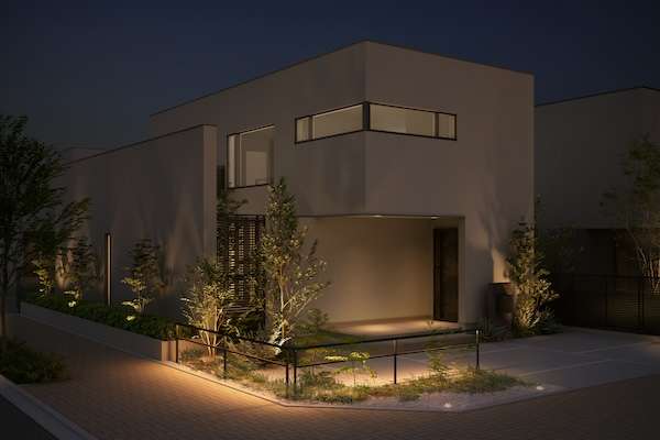 このほか、留め石をモチーフに緩やかに空間を仕切る「フェンスAL」のオプションとして、外構照明「美彩」のシームレスラインライトを設定した。