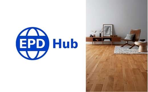 EPDHub認証のロゴマークと今回認証を取得した「オール国産材フローリング」