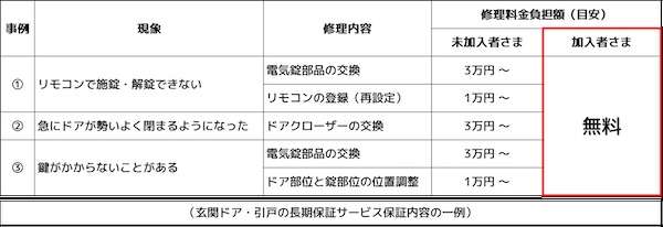 長期保証サービスではこれまで、玄関ドア・引戸の電気錠や電動開閉装置が保証対象だったが、新たに玄関ドア・引戸も対象になった。