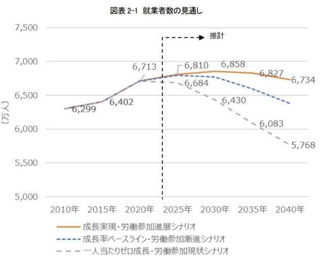 推計は、1人当たりの実質経済成長率、女性や高齢者の労働参加などの見通しを前提に、三つのシナリオを設定した。成長率がおおむね1%台後半で推移し、女性や高齢者の労働市場への参加が大きく進んだ場合は、同10万人増の6734万人と就業者数を維持できる見込みだ。
