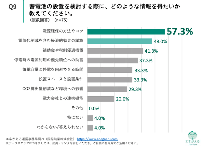 家庭用蓄電池に関心および設置意向がある人に、蓄電池設置の検討時にどのような情報を得たいか聞いたところ、「電源確保の方法やコツ」(57.3%)、「電気代削減を含む経済的効果の試算」(48.0%)、「補助金や税制優遇措置」(41.3%)が上位となった。