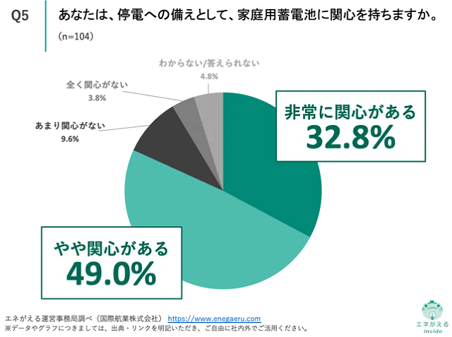 太陽光・蓄電池の経済効果診断「エネがえる」を提供する国際航業(東京都新宿区)はこのほど、未就学児の子どもを持つ親104人を対象に実施した「災害時の電源確保に関する意識調査」の結果を発表した。停電への備えとして「家庭用蓄電池」に関心を持っている人は、「非常に関心がある」(32.8%)、「やや関心がある」(49.0%)をあわせて、81.8%にのぼることがわかった。