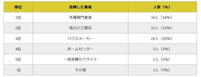 『外構工事をどの業者に依頼したか』聞いたところ、最も多かったのは100人中34人が回答した「外構専門業者」だった。続いて「地元の工務店」(32人)、「ハウスメーカー」(26人)、「ホームセンター」(3人)、「一括見積サイト」(2人)となった。