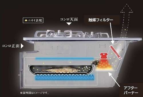 グリル使用時の煙とにおいをアフターバーナー+触媒フィルターのダブルでカットする「スモークカットグリル」を搭載。